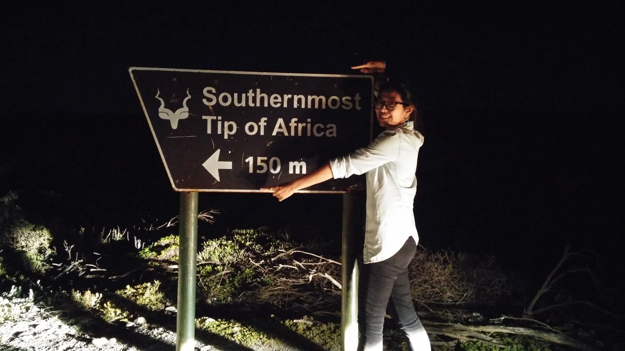 Macey at Cape Agulhas, the Southernmost tip of Africa where the Indian and Atlantic Oceans meet.