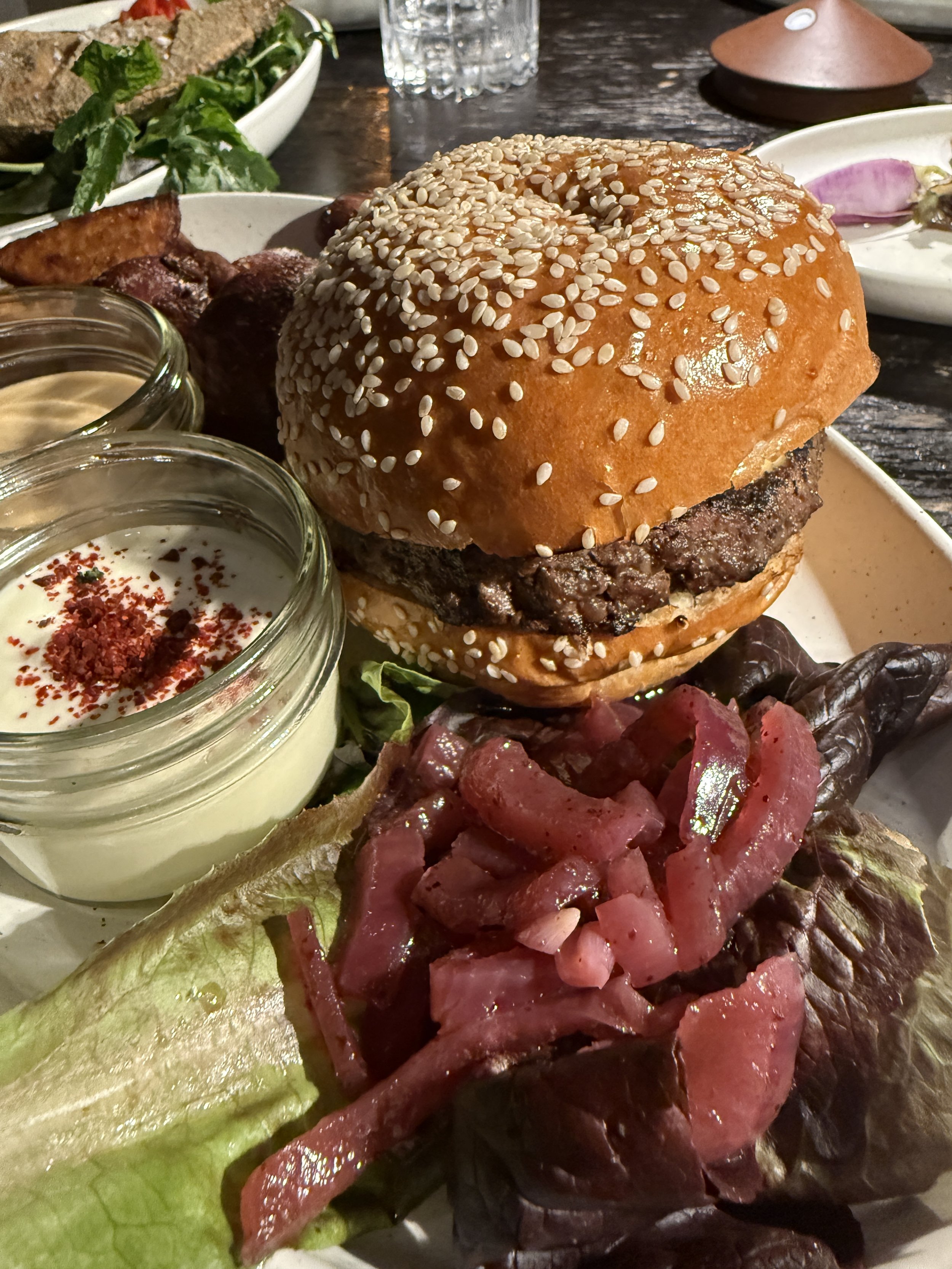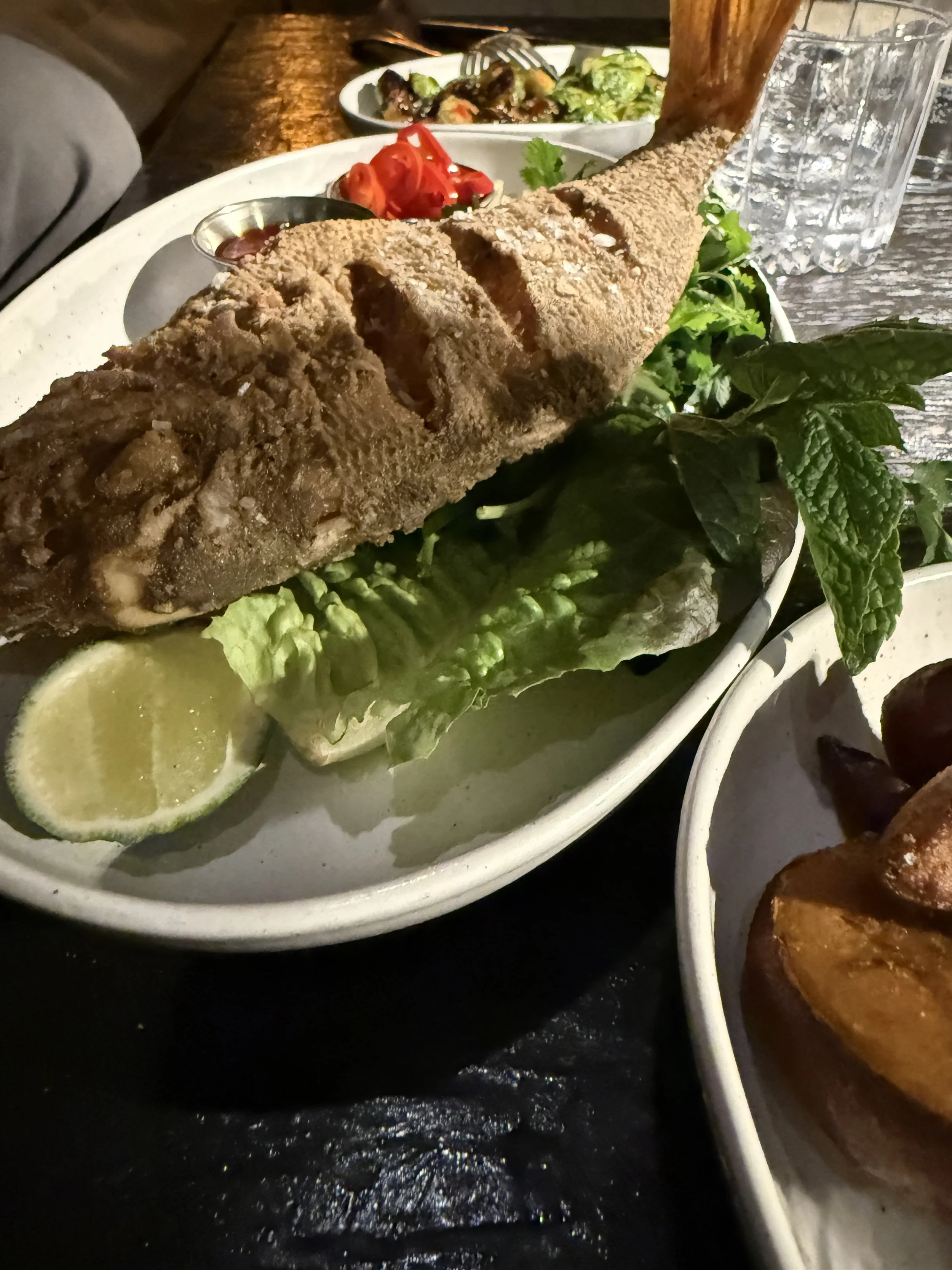For Mains we opted for the While Fried Red Snapper ($45) that comes with fresh herbs, lime, and chili crunch. And, the Bone Marrow Burger ($32) that comes on a sesame potate roll, and served with pickled onion and marinated tomato. It’s also served with sweet potato wedges. For dessert, the sorbet hit the spot. Not too heavy, it’s the best option when the meal has been comprehensive and filling.