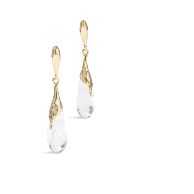 The teardrop earrings are 6g’s in weight, and inspired by the reflective quality of water in motion. The 14k gold plated teardrop post earrings have an organic silhouette of custom molten metalwork dripping over hand-sculpted polished Lucite drops that reflect light with every movement.