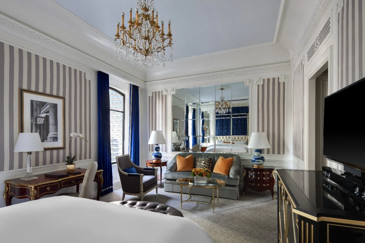 Deluxe rooms with butler service include complimentary pressing of 2 garments per stay, business services (for a fee), and an honor bar. This room type is sizable at 41 square metres and perfect for two people. It includes a small living area, high ceilings, and a possible room connection access. Ceilings are high with period moulding detailing and a glamorous chandelier in the bedroom. The blue canopy behind the bed offers a regal touch to the room, and contrasts well with the grey and white horizontal wallpaper stripes. Typically, rooms come with a king bed with a pillowtop mattress and duvet, but two double beds are possible. Bathrooms are marbled and a Whirlpool, different lighting types, a Dyson hair dryer, robe, and slippers. Bottled water is complimentary, room service is 24 hours, and there is also a minibar.