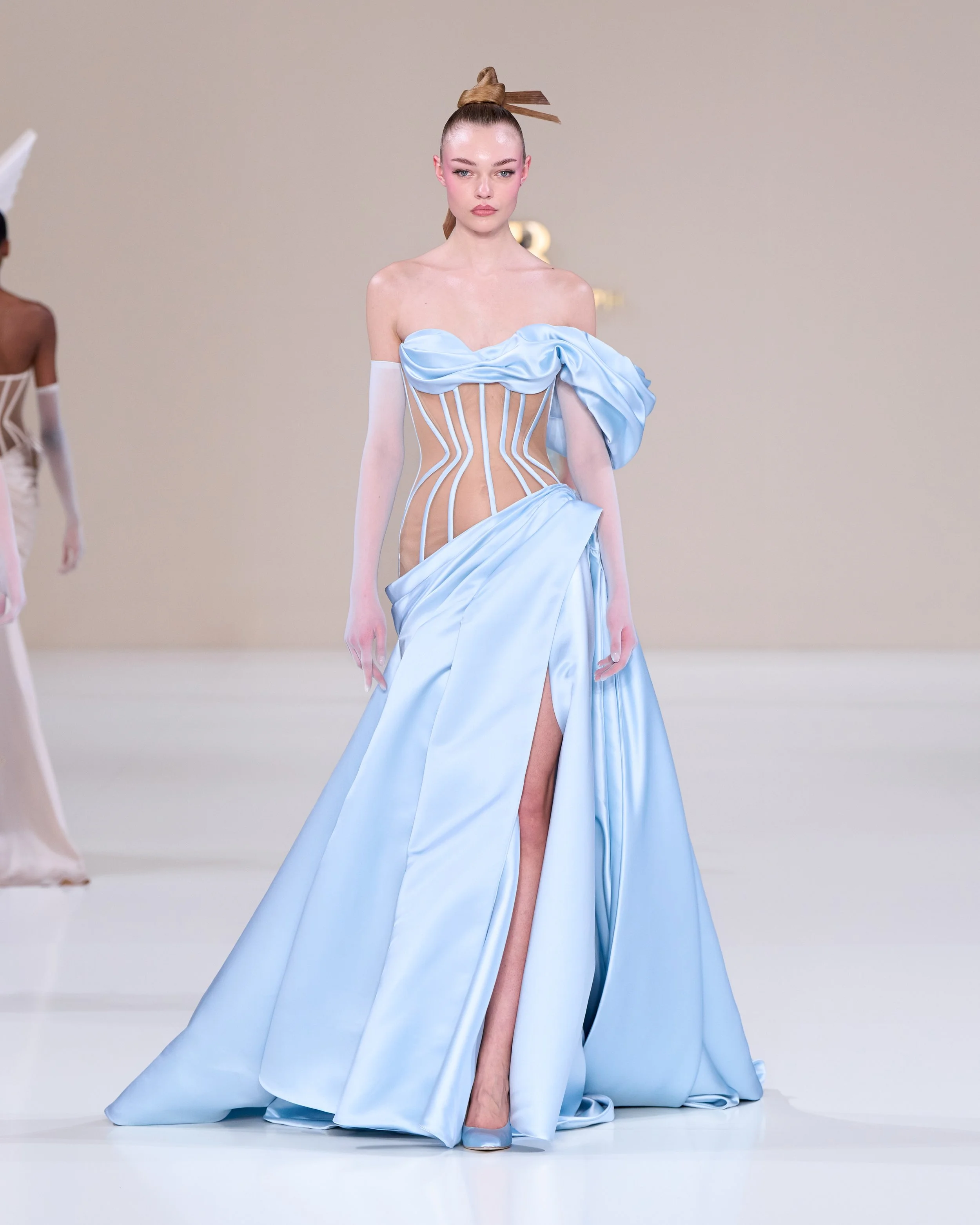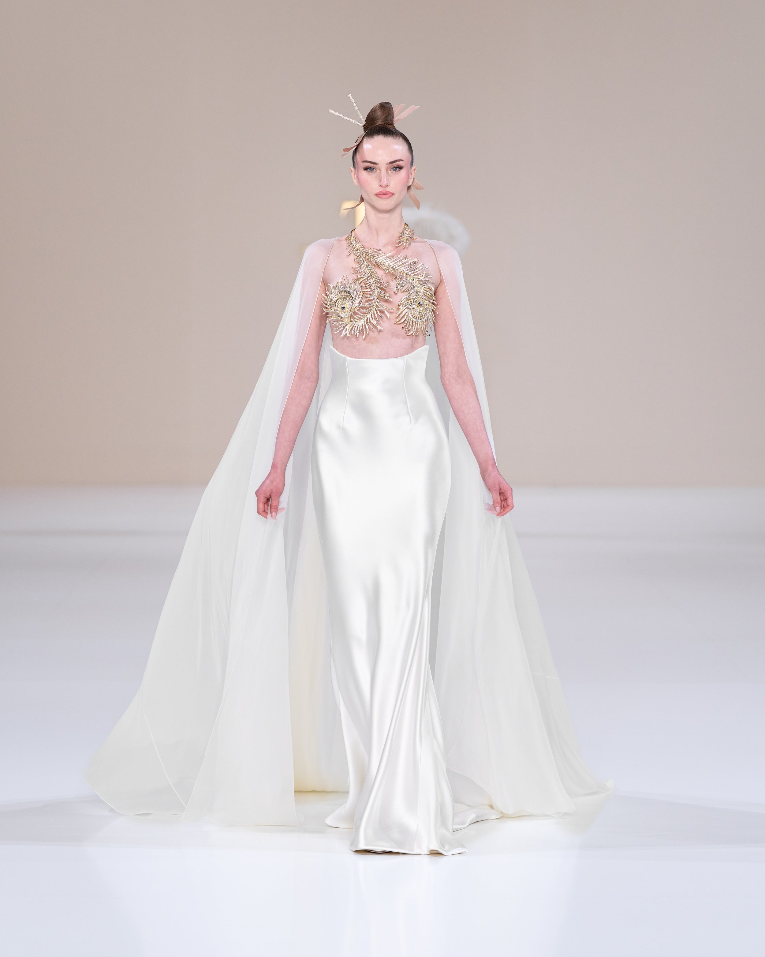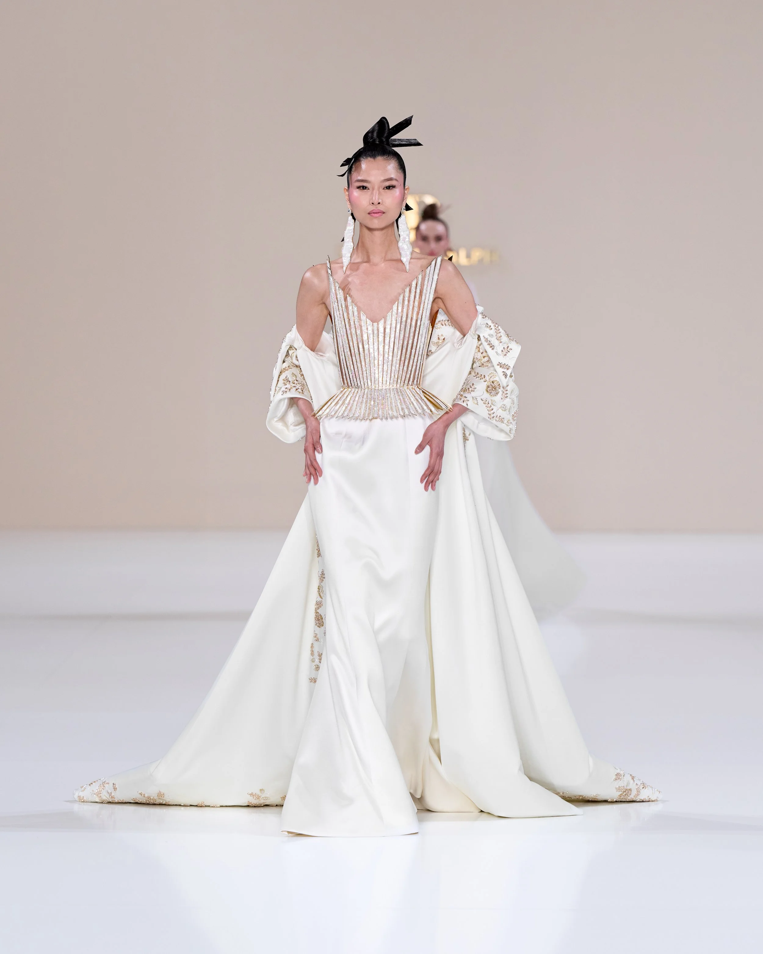 Held at Pavillon Cambon, in the heart of Paris, the collection tells the story of 'La Lumière Dorée.’ Geometric lines and angles are poignant, hinting towards the art of origami. Hourglass silhouettes and fan shapes are poignant in the designs.