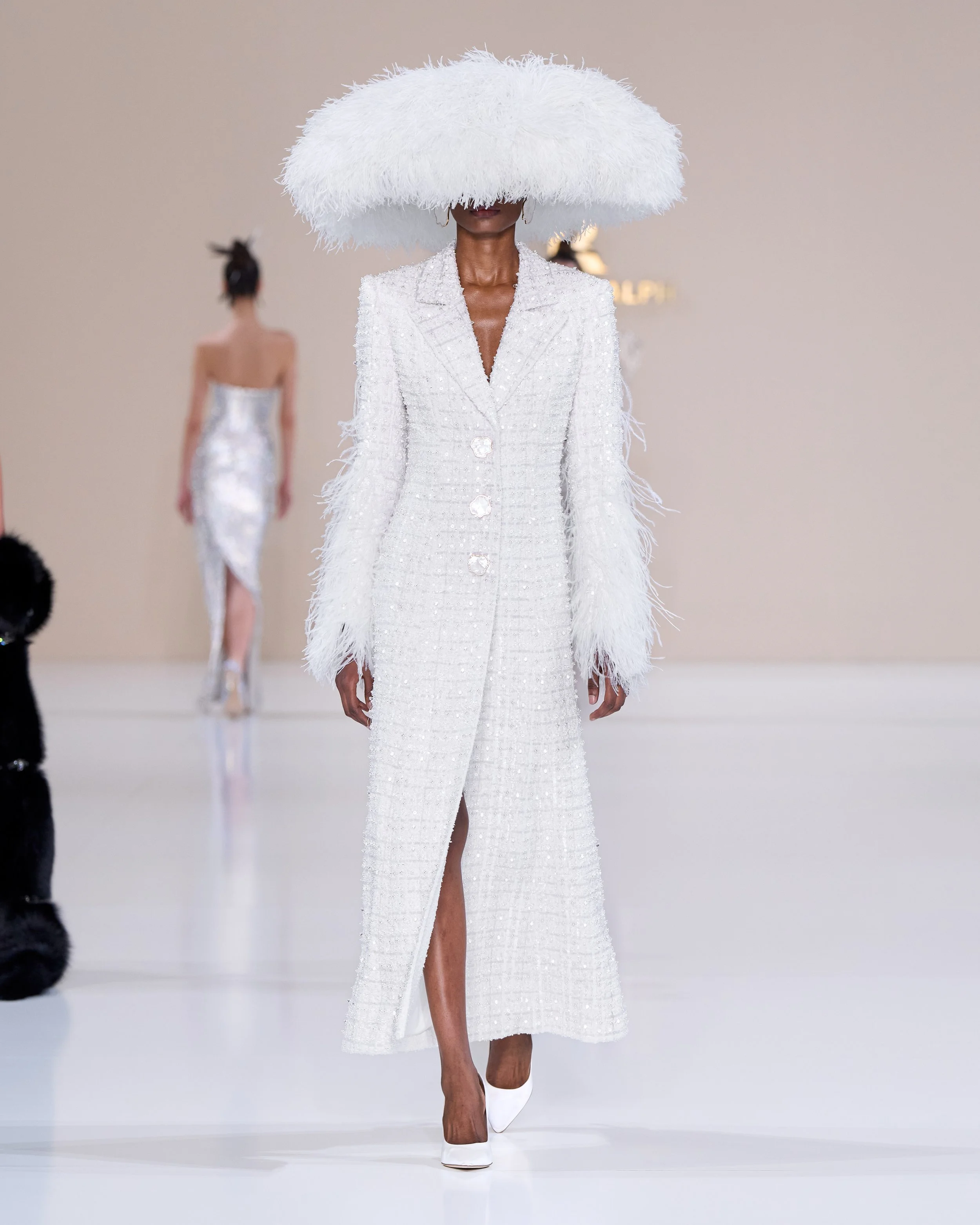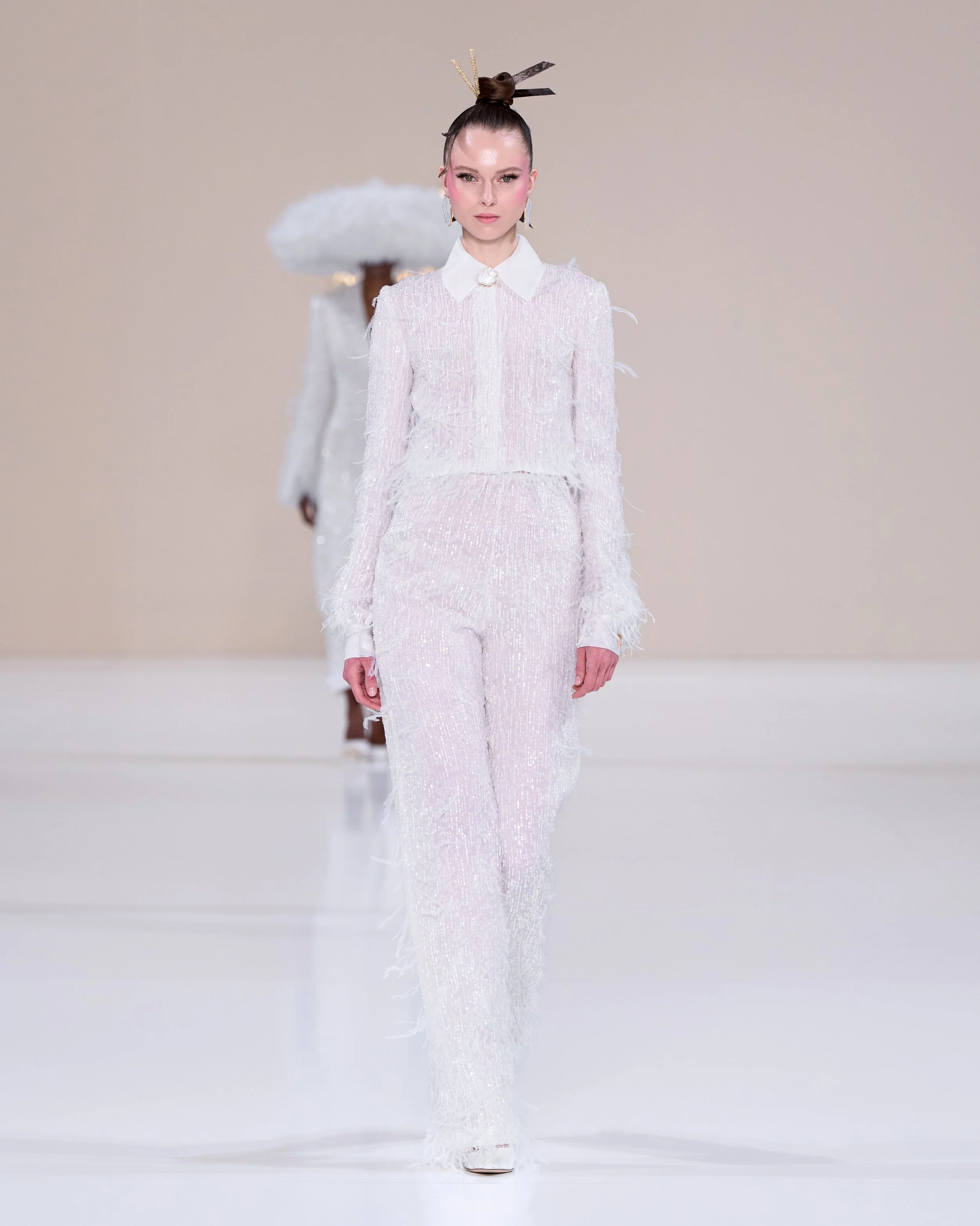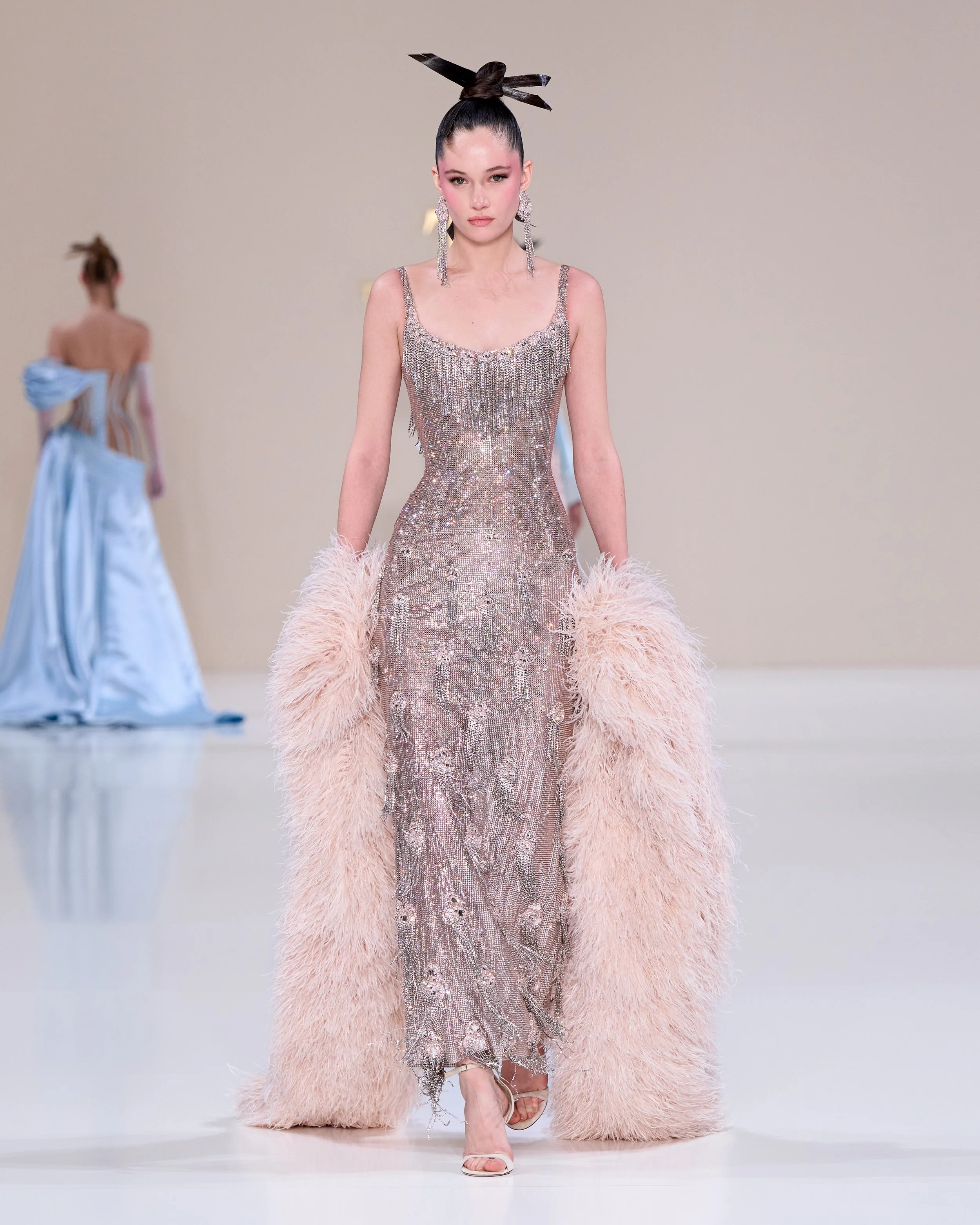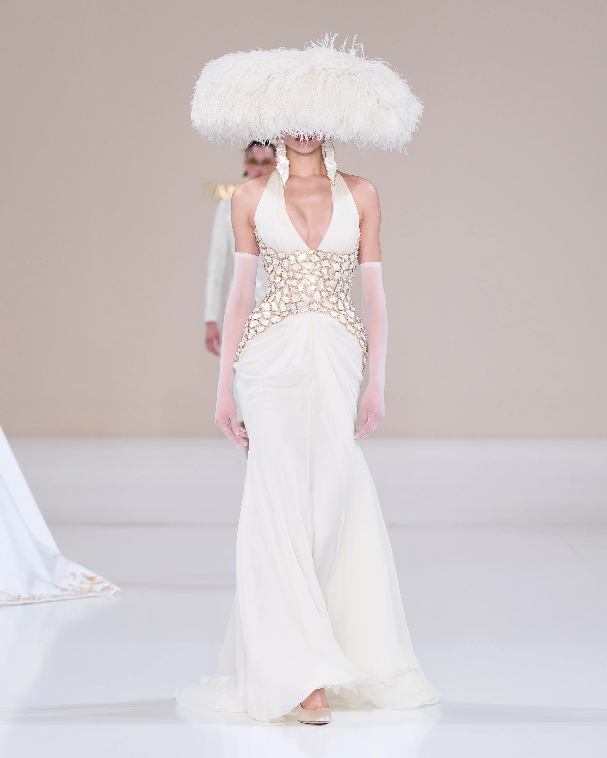 To tell this season’s sartorial story, Pearlescent shards, metalwork, and feathers are used. These materials are contrasted with mint satin, shades of white and metallic embroidery. Looks are young but there’s something for all stages of life: